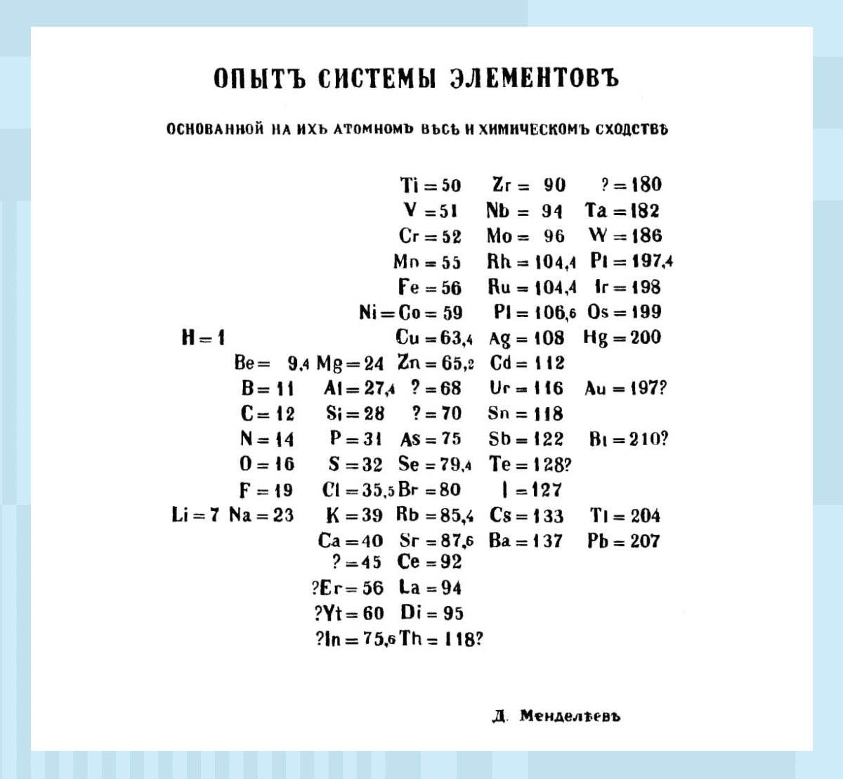 Этот принцип Менделеев проиллюстрировал в таблице, в которой были представлены все 63 известных на тот момент химических элемента. При её создании учёный предпринял ряд весьма смелых шагов.