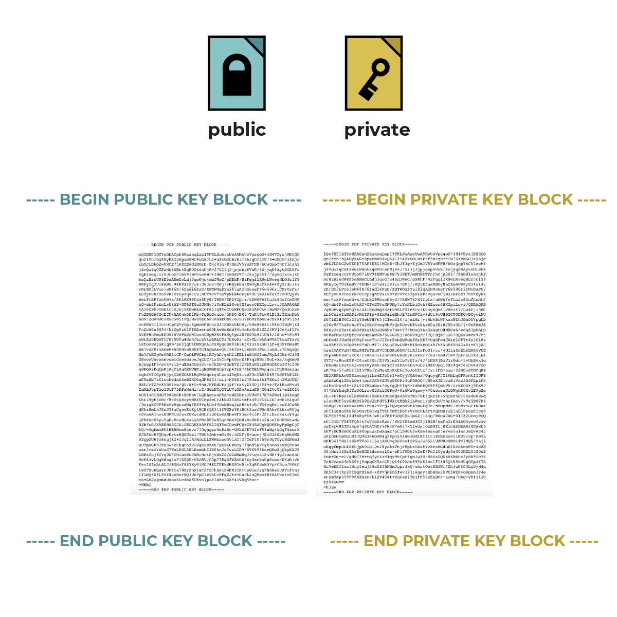 Закрытый и открытый ключи создаются парами. Они математически связаны друг с другом. Вы можете представить их в виде камня, расколотого пополам. Если соединить обе половинки, то они идеально подойдут друг к другу, образуя единое целое. Ни одна часть никакого другого камня не подойдёт. Файлы открытого и закрытого ключей совпадают также. Они состоят из очень больших чисел, генерируемых компьютером.