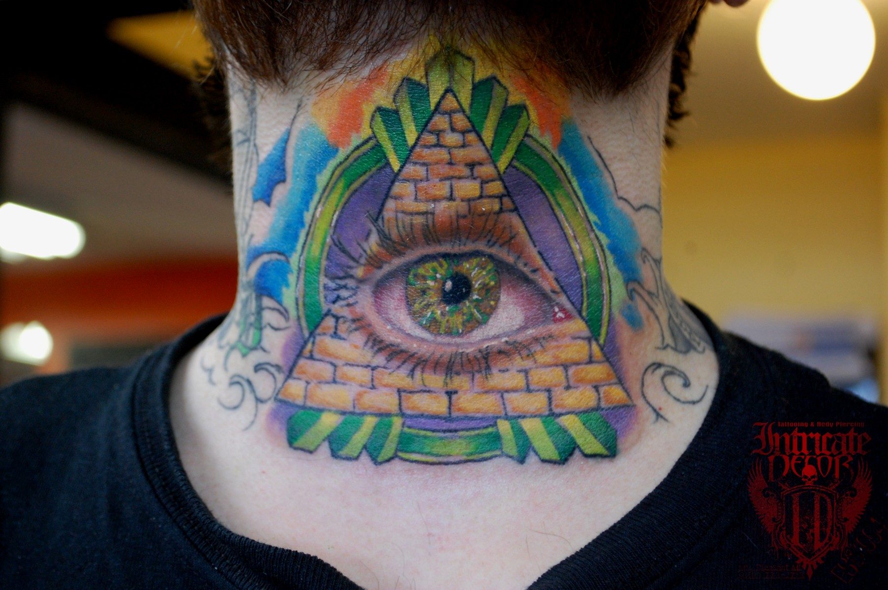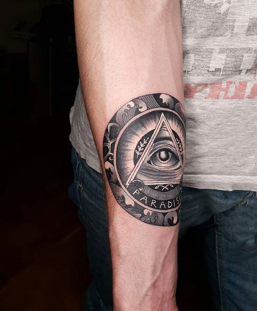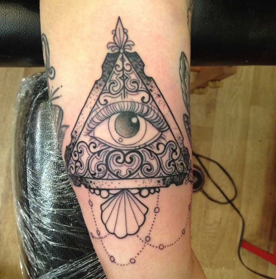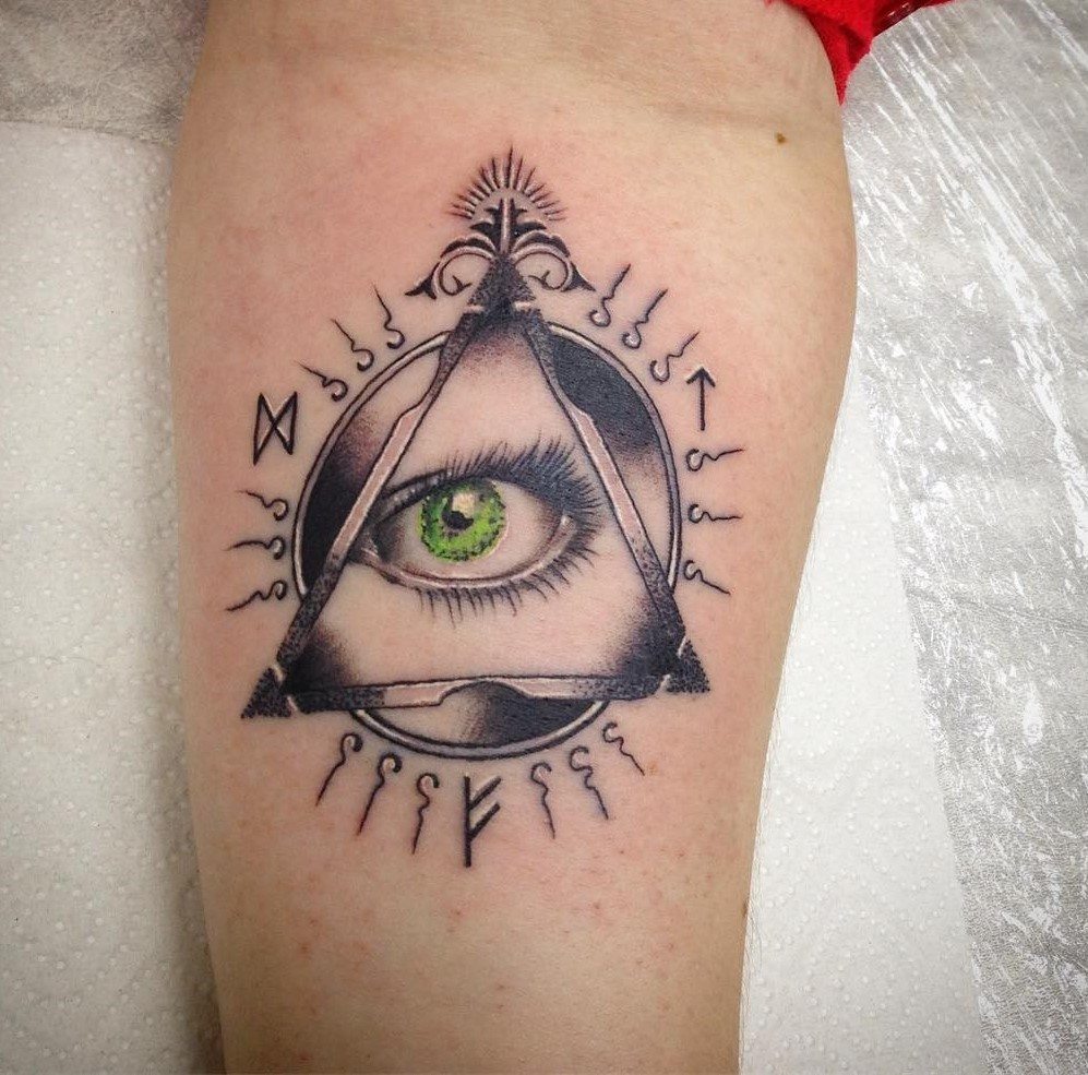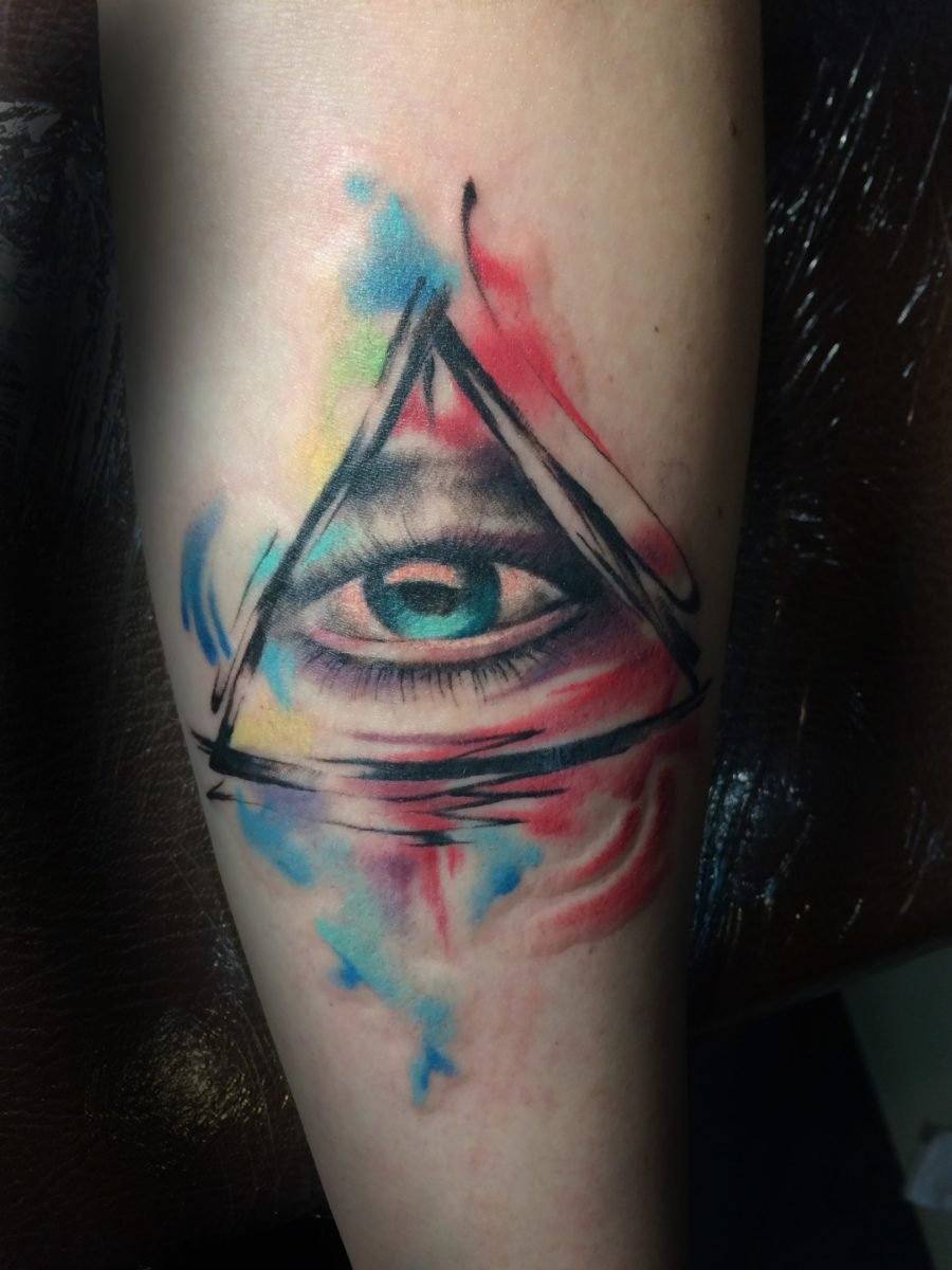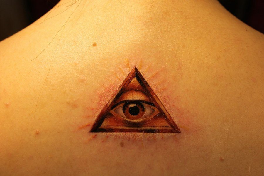 Примеры эскизов татуировки всевидящее око, безусловно есть во всех салонах, и если вы уже точно определились, какую часть вашего тела будет украшать такое изображение, то следует внимательно изучить разнообразные эскизы. Как упоминалось выше, в большинстве вариантов глаз в тату помещён в треугольник, но это не единственный пример, который можно себе позволить. Татуировка может быть однотонной или цветной, что особенно востребовано у прекрасной половины нашего общества. Кроме треугольника основные детали изображения прекрасно дополняются различными элементами, которые в свою очередь могут изменить символику татуировки. Основной рисунок может выступать в качестве отдельного рисунка, а может быть частью композиции и красоваться на фоне космоса, ночного неба или солнечных лучей. Помимо этого, образ всевидящего ока красиво дополняется любой растительностью, животными, птицами и рептилиями. Не менее интересен эскиз с геометрическими элементами, разнообразным орнаментом, абстракцией и надписями. Вам стоит только внимательно изучить предложенные вариации.