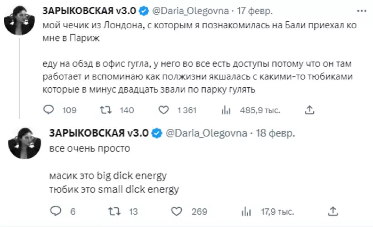 Однако первоисточником принято считать твит блогера Дарьи Зарыковской: