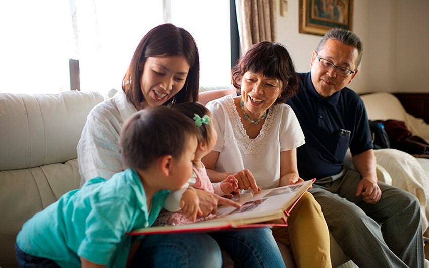 Имя чужой семьи по-японски – го-казоку, где «го» показывает глубокое уважение к человеку. Если нужно сказать реплику, в которой упоминаются бабушки и дедушки, их называют обаа-сан, оджии-сан. К чужим родителям принято обращаться го-рюушин, а дядю и тетю называют оджи-сан, оба-сан. Приставка «го» записывается как ご, суффикс сан – さん. Живые ситуации применения таких официальных вежливых вариантов именования родственников встречаются в текстах песен дуэта Дза Пинац – Эми и Юми Ито.
