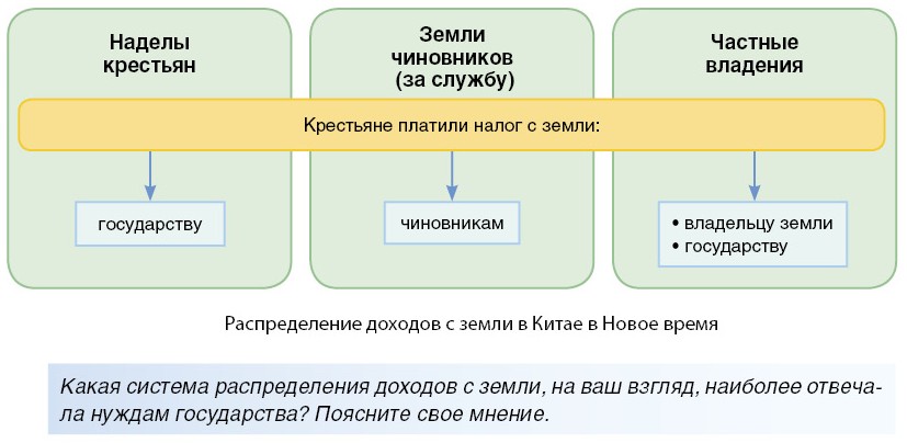 В Китае еще с Раннего Средневековья утвердилась государственная надельная система. Все крестьяне были наделены примерно одинаковыми земельными участками, которые время от времени перераспределялись. За пользование землей нужно было выполнять для государства повинности — отдавать часть урожая в казну и трудиться определенное количество дней на государственных работах. Большие земельные наделы с крестьянами получали многочисленные чиновники и знать. Крестьяне, работавшие на таких землях, отдавали часть урожая не государству, а владельцу земли. Владения чиновников не были их собственностью, а давались на время службы и считались государственными. Крупные землевладельцы фактически имели не столько право на землю, сколько право на получение части дохода от нее.