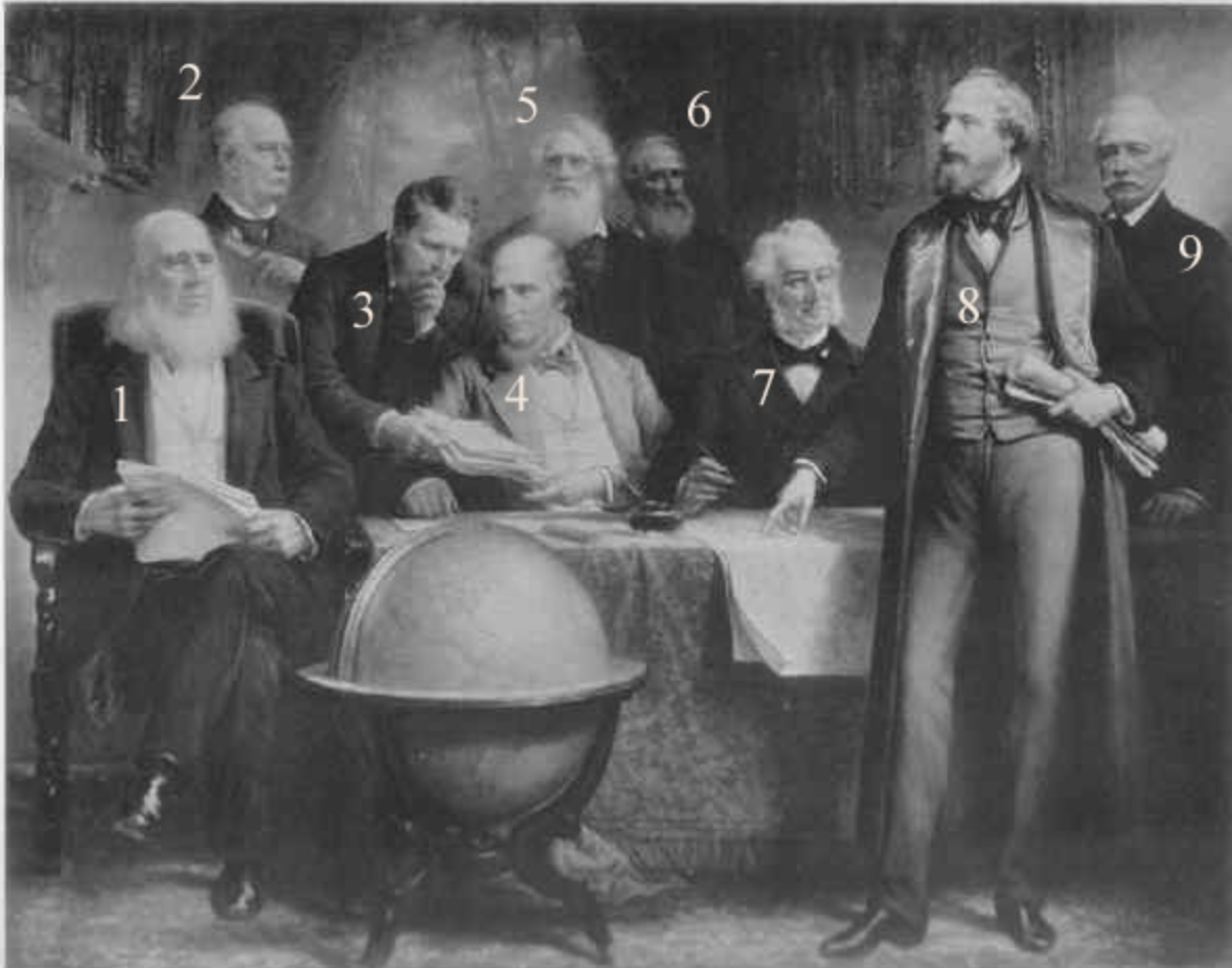 1.Питер Купер (президент), 2. Дэвид Филд, 3. Чандлер Уайт (секретарь), 4. Маршалл Робертс, 5. Сэмюэл Морзе (вице-президент), 6. Дэниел Хантингтон, 7. Мозес Тейлор (казначей), 8. Сайрус Филд, 9. Уилсон Хант