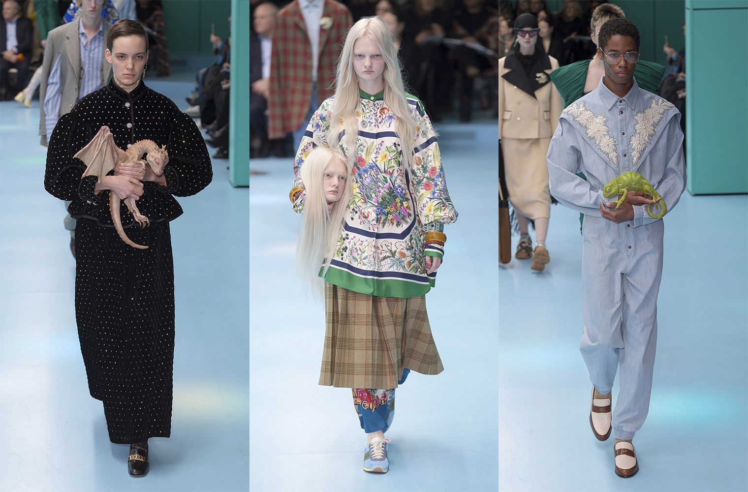 Шоу также запомнилось несколькими необычными аксессуарами. Модели шли по подиуму, держа в руках идеальную копию собственной головы, детенышей драконов, игуан и змей, которые являются символом Gucci. Имитация головы была похожа на отсылку к образу кефалофора — обезглавленного святого, которого часто изображали в Средневековье, а дракон, по словам бренда, был вдохновлен «Легендой о маленьком драконе в банке» — собственной игрой Микеле, который инсценировал поиск мифического существа в своем гараже в Оксфордшире.