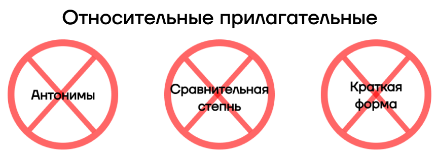 Такое прилагательное не может быть выражено в большей или меньшей степени, оно постоянно. Также они не образуют краткую форму, не употребляются со словом «очень», не имеют антонимов.