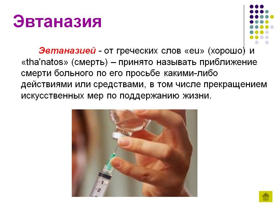 Термин эвтаназия происходит от греческих слов eu -«хорошо» и thanatos — «смерть» и означает сознательное действие, приводящее к смерти безнадежно больного и страдающего человека относительно быстрым и безболезненным путем с целью прекращения неизлечимой боли и страданий.