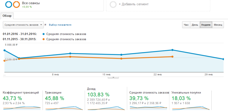 Как видно на скриншоте, количество транзакций выросло именно за счет роста конверсии в заказы, а не за счет увеличения трафика, как это часто бывает.