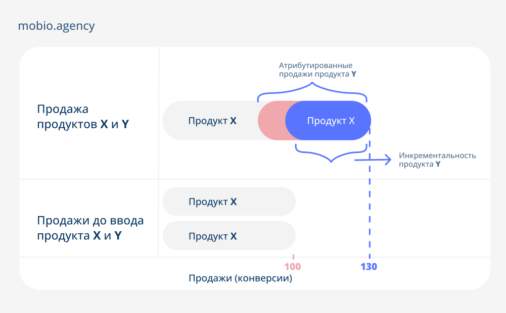 Как происходит разграничение понятий атрибуции и инкрементальности, можно представить, сильно сузив количество исходных данных. Допустим, у вас есть некий продукт Х, который успешно реализуется или приносит стабильные конверсии (100 в месяц). Вы решаете добавить продукт Y, запустить на него рекламу и атрибутировать. Выбранная модель за условленный период времени присвоит продукту Y определенное количество продаж — 50. Однако инкрементальность продукта Y будет меньше: