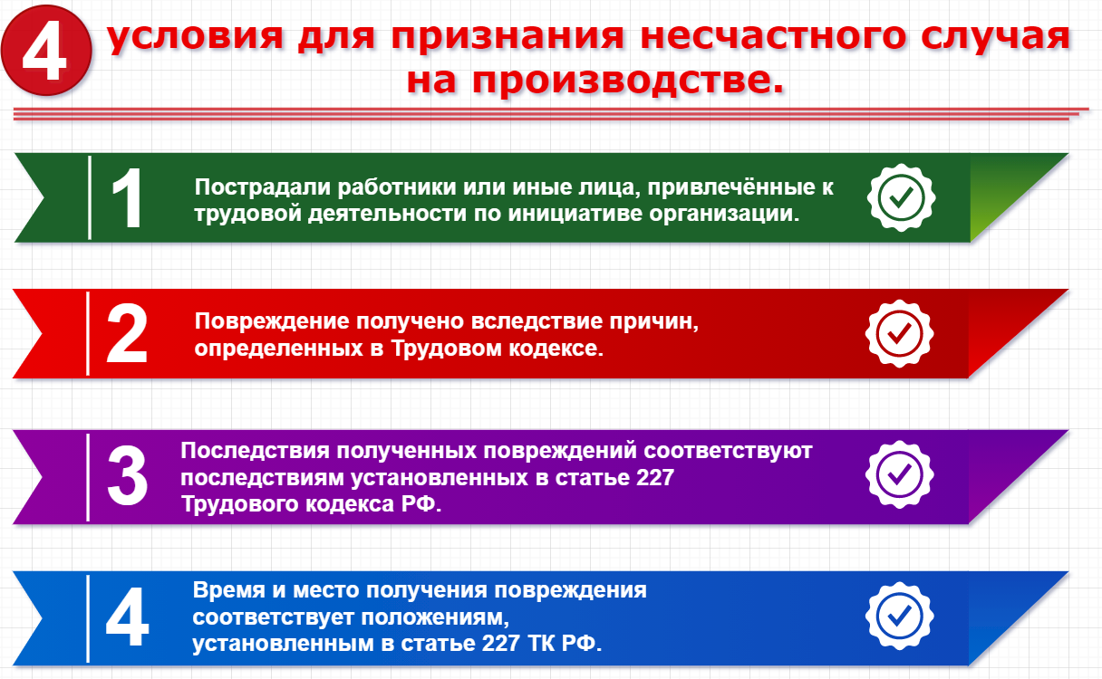 Для признания несчастного случая на производстве, он должен отвечать одновременно 4-м условиям (ст. 227 ТК РФ):