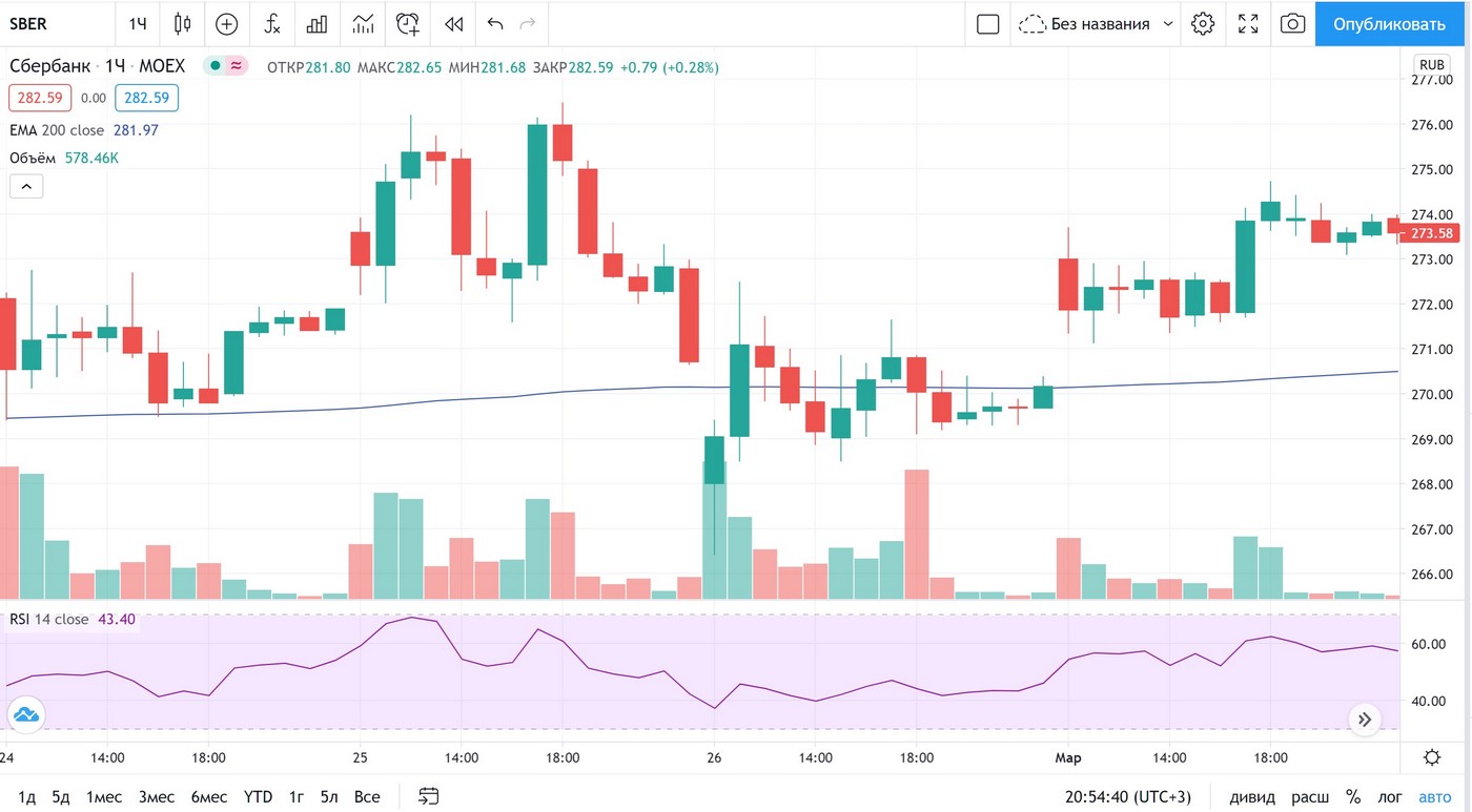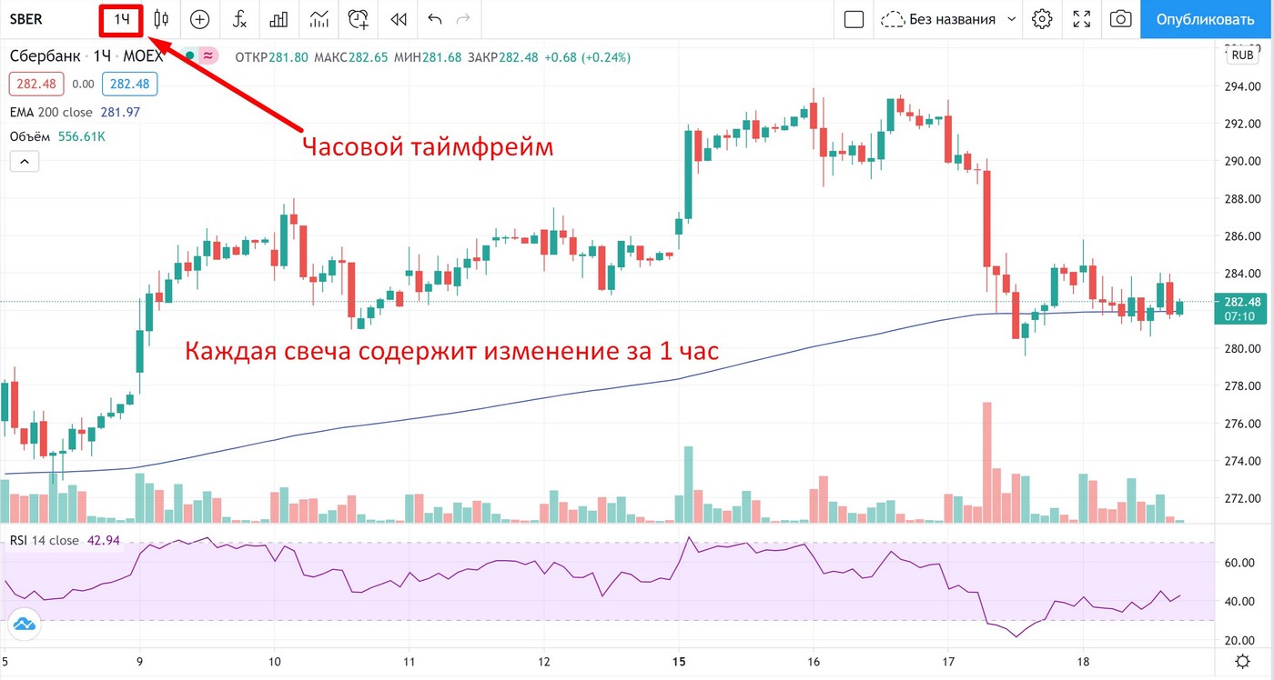 Большинство трейдеров смотрят график в виде японских свечей. Одна свеча показывает изменение биржевых котировок за выбранный период в таймфреме. Например, если выбран период H1, то одна свеча содержит в себе изменения за один час.