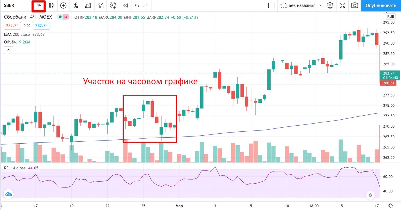 На четырехчасовом участок выше будет выглядеть лишь небольшой частью графика: