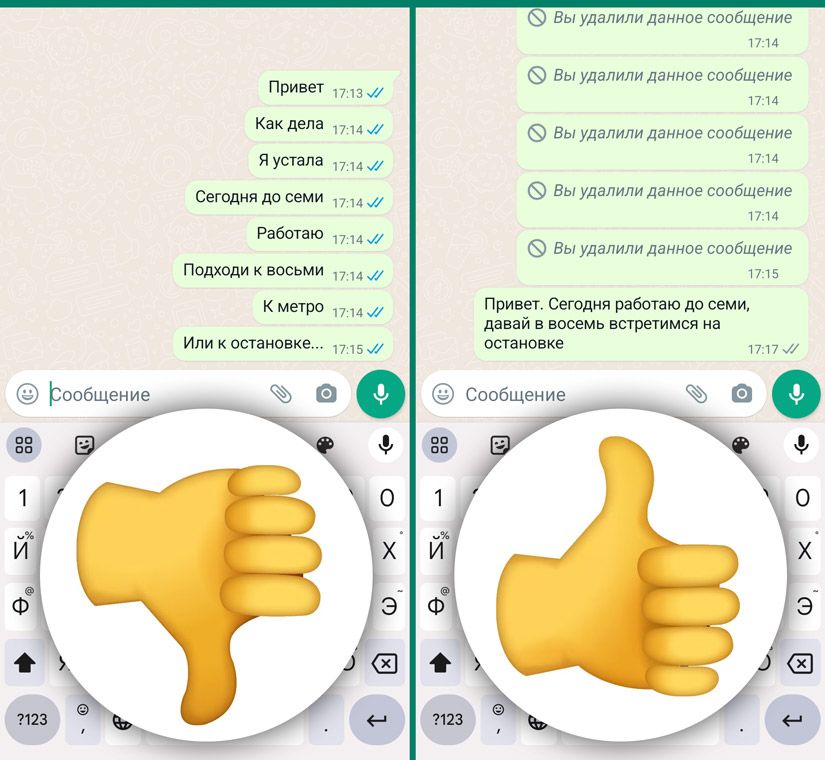 Каждое сообщение должно содержать законченную мысль. Например: «Привет. Я работаю до семи, давай в восемь встретимся у метро». Длинный деловой текст удобно сначала написать в заметках, перечитать, при необходимости внести правки и только потом отправлять в мессенджер.