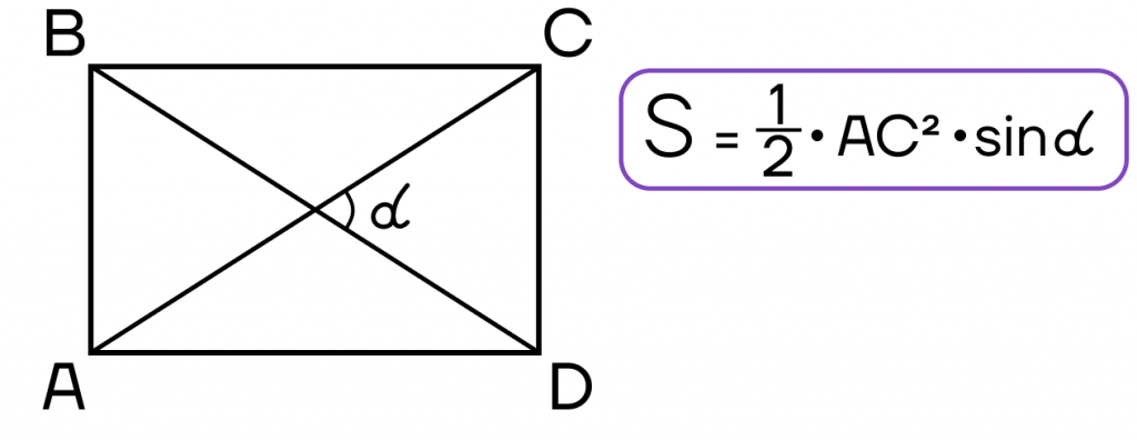 - Площадь прямоугольника равна половине произведения квадрата диагонали на синус угла между диагоналями.