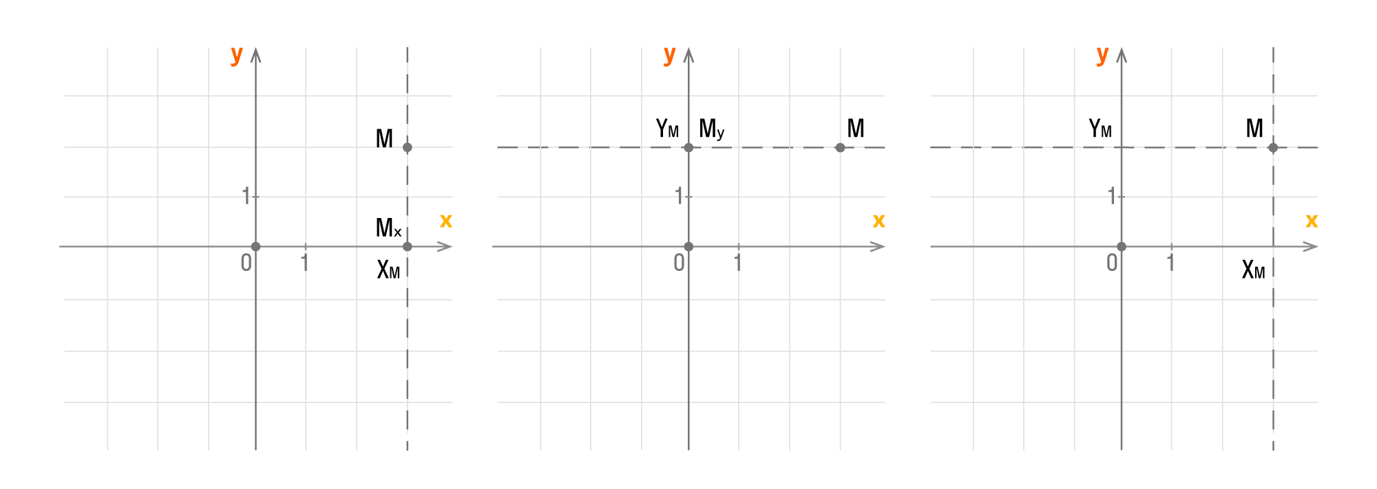 Пусть точка является проекцией точки Mx в Ox и My в Oy. Это означает, что через точку M можно провести прямые, перпендикулярные осям Ox и Oy, после чего мы получим соответствующие точки пересечения Mx и My. Тогда точке Mx на оси Ox соответствует номер xM, а My на Oy — yM. Как это отображается на осях координат: