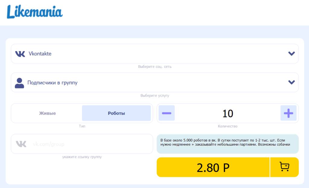 На этом сервисе возможно увеличить число подписчиков в ВК без заданий хотя и не бесплатно, но очень дешево, если осуществлять это за счет роботов.