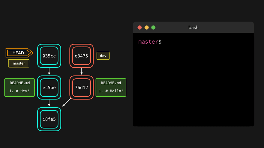 Если мы хотим смержить в , это приведет к конфликту: хотите, чтобы заголовок был Hello! или hey!?