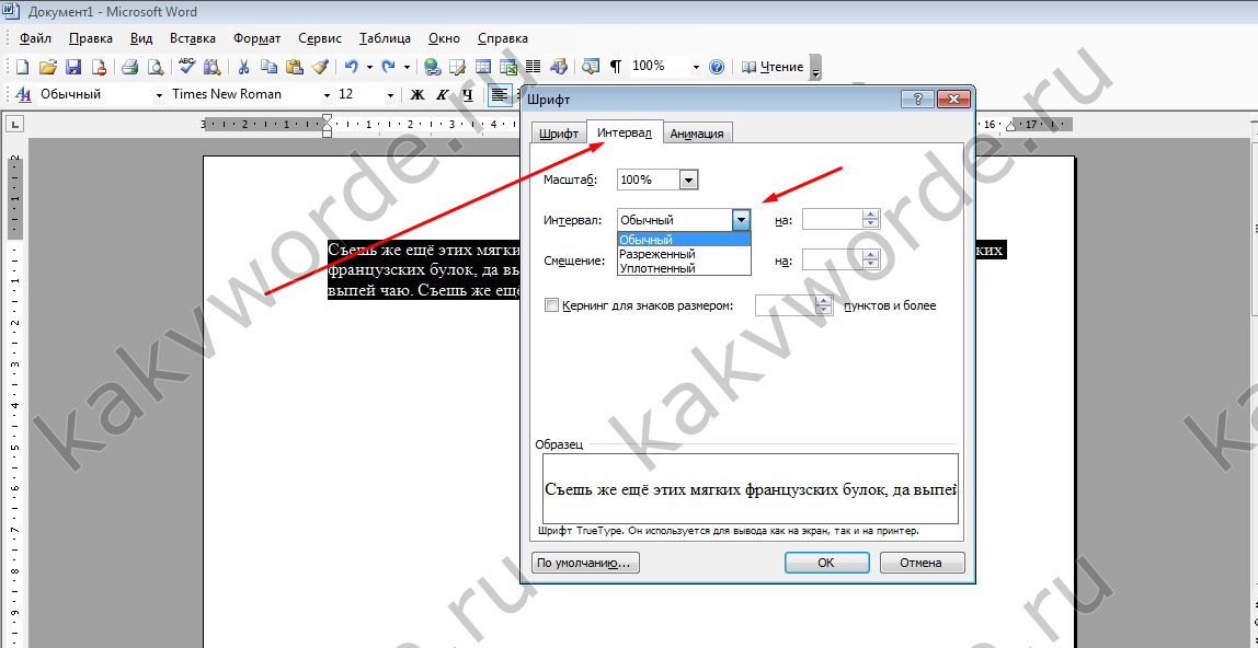 - Зайти во вкладку «Интервал» и указать значение «Уплотнённый» либо «Разреженный» и выставить нужный интервал в цифрах.