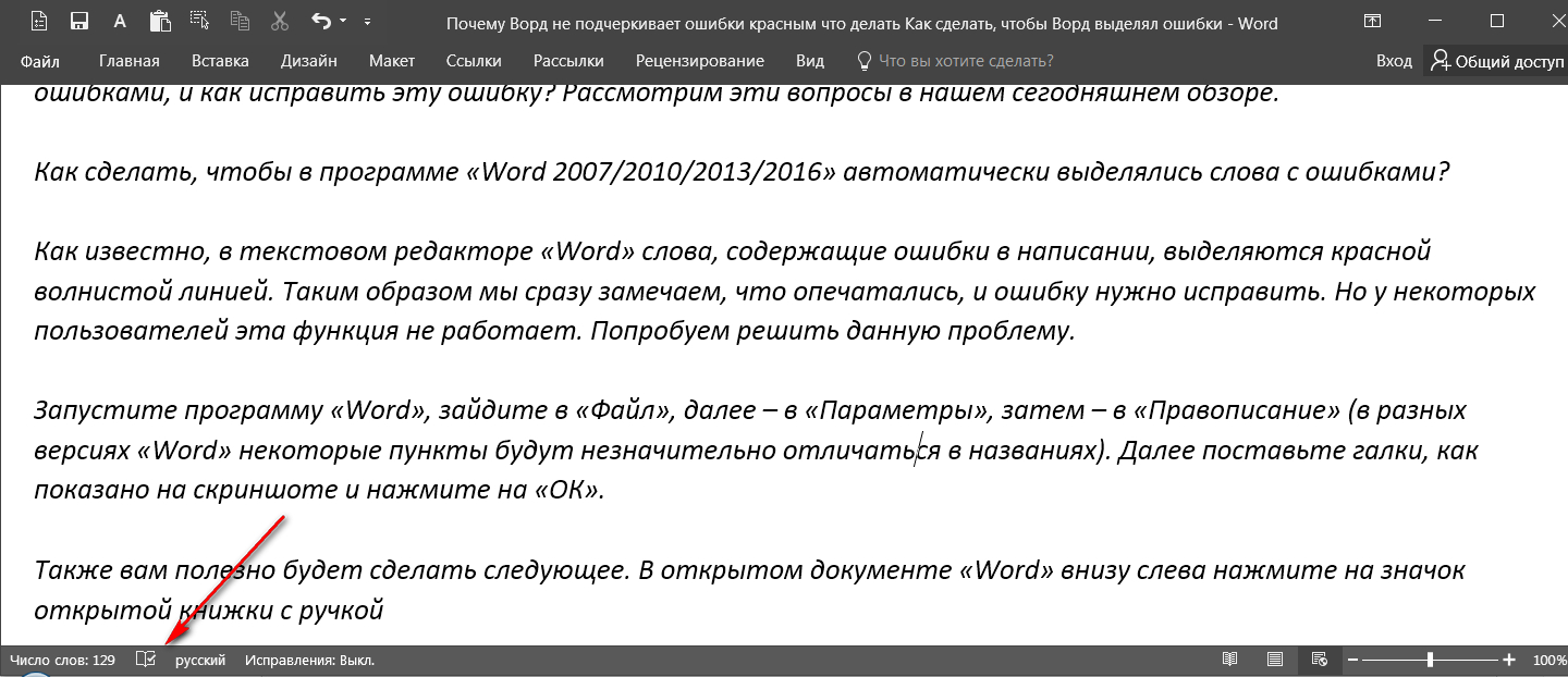 Также вам полезно будет сделать следующее. В открытом документе «Word» внизу слева нажмите правой кнопкой мышки на значок открытой книжки с ручкой. Затем в открывшемся меню проверьте, стоит ли галка напротив пункта «Проверка правописания». Если таковой нет, то поставьте ее.