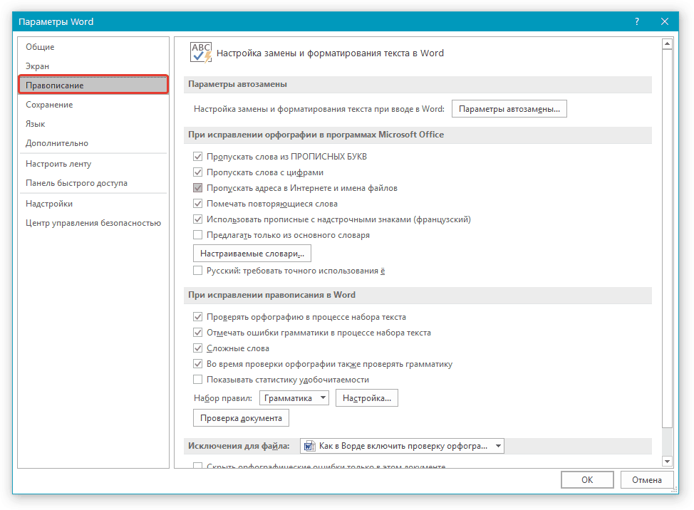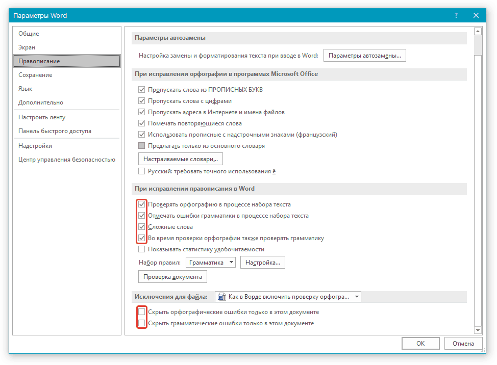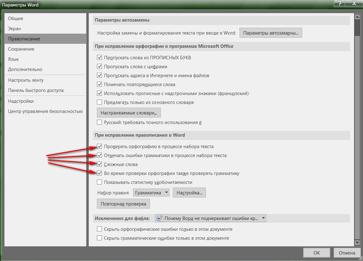 Запустите программу «Word», зайдите в «Файл», далее – в «Параметры», затем – в «Правописание» (в разных версиях «Word» некоторые пункты будут незначительно отличаться в названиях). Далее поставьте галки, как показано на скриншоте и нажмите на «ОК».
