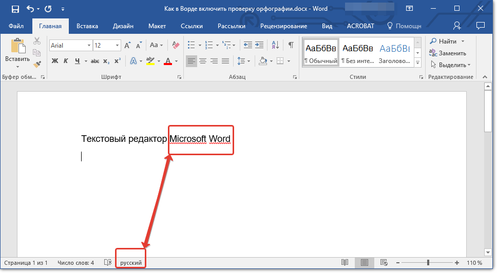 Помимо этого, не помешает проверить, какой язык установлен в настройках. Если это английский, то проверка правописания не будет работать. Внизу слева раскрытого документа «Word» нажмите левой кнопкой мышки, как показано на скриншоте. Затем в открывшемся окошке назначьте русский язык и нажмите на «ОК».