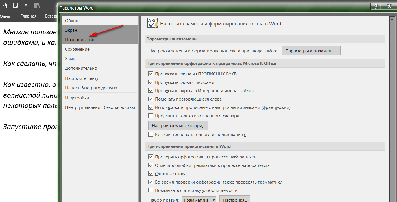 3. В появившемся перед вами окне выберите раздел “Правописание”.