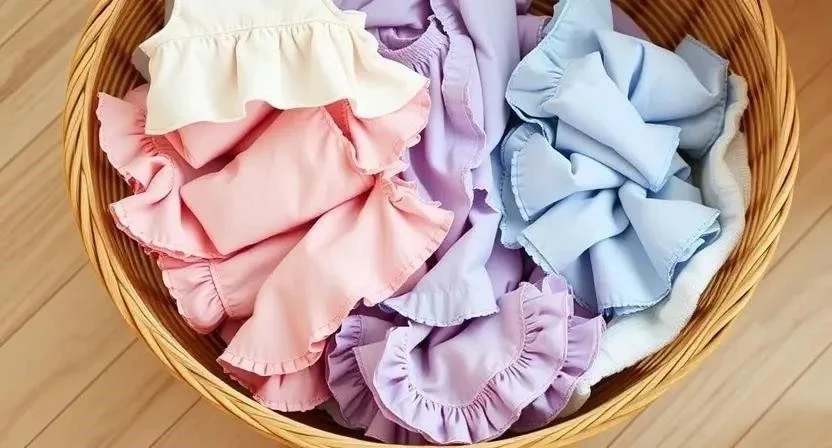 Можно ли стирать одежду с воланами в стиральной машине? Да, но только в деликатном режиме с минимальной температурой и отжимом, используя мешок для стирки.