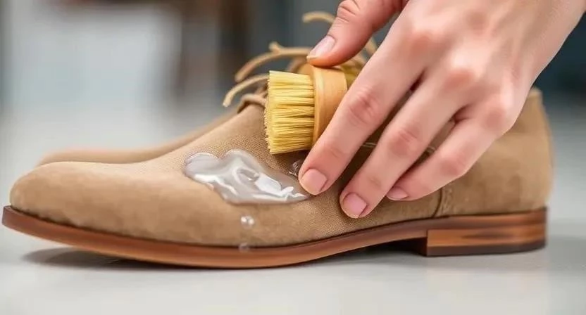 - Удаление пятен от воды (сушка): Дайте обуви высохнуть естественным путем. После высыхания расчешите ворс щеткой.