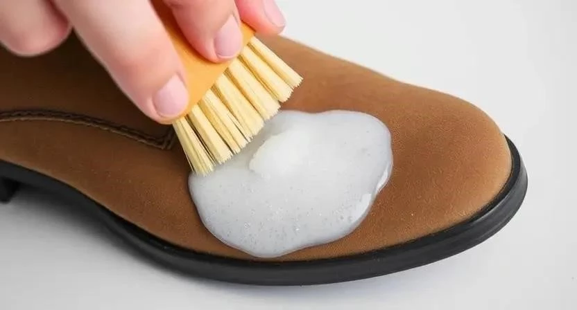 - Нанесите средство для чистки замши и аккуратно протрите обувь.